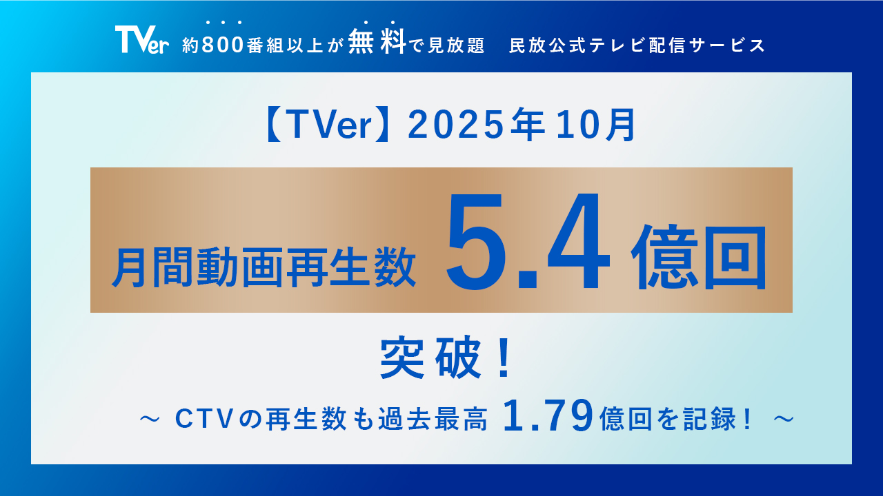 民放公式テレビ配信サービス「TVer(ティーバー)」の2025年10月の月間動画再生数が5.4億再生(※1)を記録し、サービス開始10周年の節目に、過去最高の記録を樹立しました。また、コネクテッドTV(以下、CTV)における月間動画再生数も過去最高となる1.79億再生(※2)を記録しました。