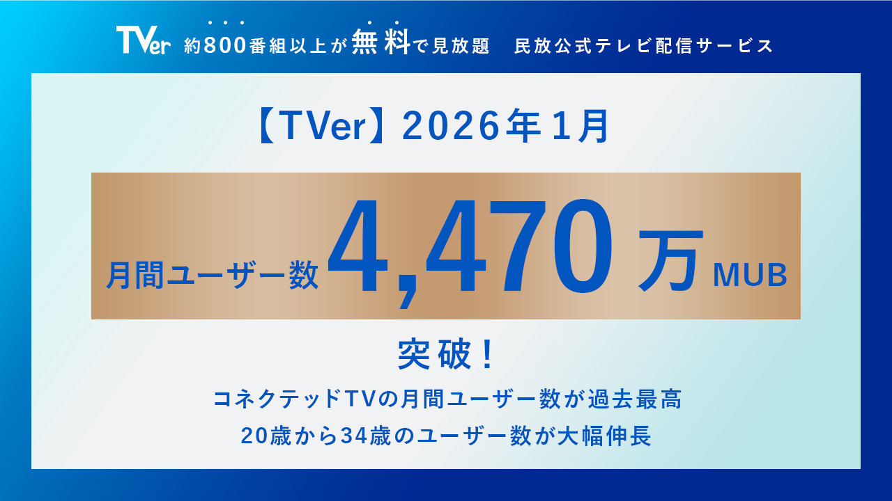 民放公式テレビ配信サービス「TVer(ティーバー)」の2026年1月の月間ユーザー数(MUB)が4,470万ユニークブラウザ(※1)を記録し、2か月連続で過去最高記録を更新しました。